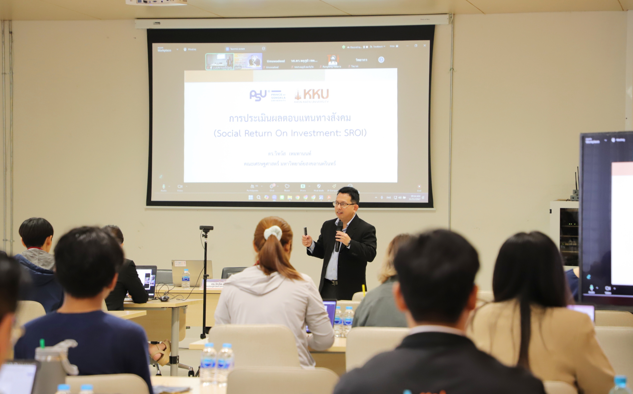 วันที่ 11 พฤศจิกายน 2567 ฝ่ายวิสาหกิจและสังคมยั่งยืน มหาวิทยาลัยขอนแก่น จัดการอบรมอบรมเชิงปฏิบัติการ “การประเมินผลตอบแทนทางสังคมจากการลงทุน (Social Return on Investment : SROI)” เพื่อเสริมสร้างความรู้และความเข้าใจเกี่ยวกับการวิเคราะห์ผลตอบแทนทางสังคมให้แก่บุคลากรภายในมหาวิทยาลัยและหน่วยงานที่เกี่ยวข้องทั้งภาครัฐและเอกชน โดยมีผู้เข้าร่วมทั้งในห้องประชุม M5 ชั้น 3 อาคารอำนวยการอุทยานวิทยาศาสตร์ มหาวิทยาลัยขอนแก่น และผ่านระบบ Online Zoom Meeting จำนวนกว่า 180 คน