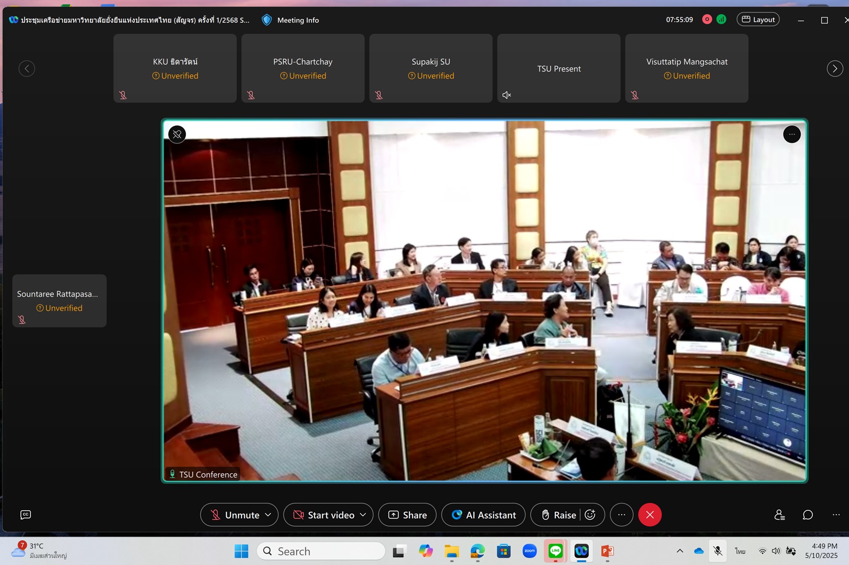เมื่อวันที่ 10–11 พฤษภาคม 2568 ฝ่ายวิสาหกิจและสังคมยั่งยืน มหาวิทยาลัยขอนแก่น นำโดย ศาสตราจารย์ ดร.ธิดารัตน์ บุญมาศ รองอธิการบดีฝ่ายวิสาหกิจและสังคมยั่งยืน พร้อมด้วยนางสาววราภรณ์ ผิวพรรณงาม รองผู้อำนวยการศูนย์ส่งเสริมวิสาหกิจและสังคมยั่งยืน และบุคลากรจากศูนย์ฯ เข้าร่วมประชุมเครือข่ายมหาวิทยาลัยยั่งยืนแห่งประเทศไทย (Sustainable University Network Thailand: SUN Thailand) สัญจร ครั้งที่ 1/2568 ณ มหาวิทยาลัยทักษิณ วิทยาเขตพัทลุง ผ่านระบบออนไลน์และร่วมประชุมในพื้นที่ เพื่อแลกเปลี่ยนแนวทางการขับเคลื่อนเป้าหมายการพัฒนาที่ยั่งยืน (SDGs) ในระดับอุดมศึกษา