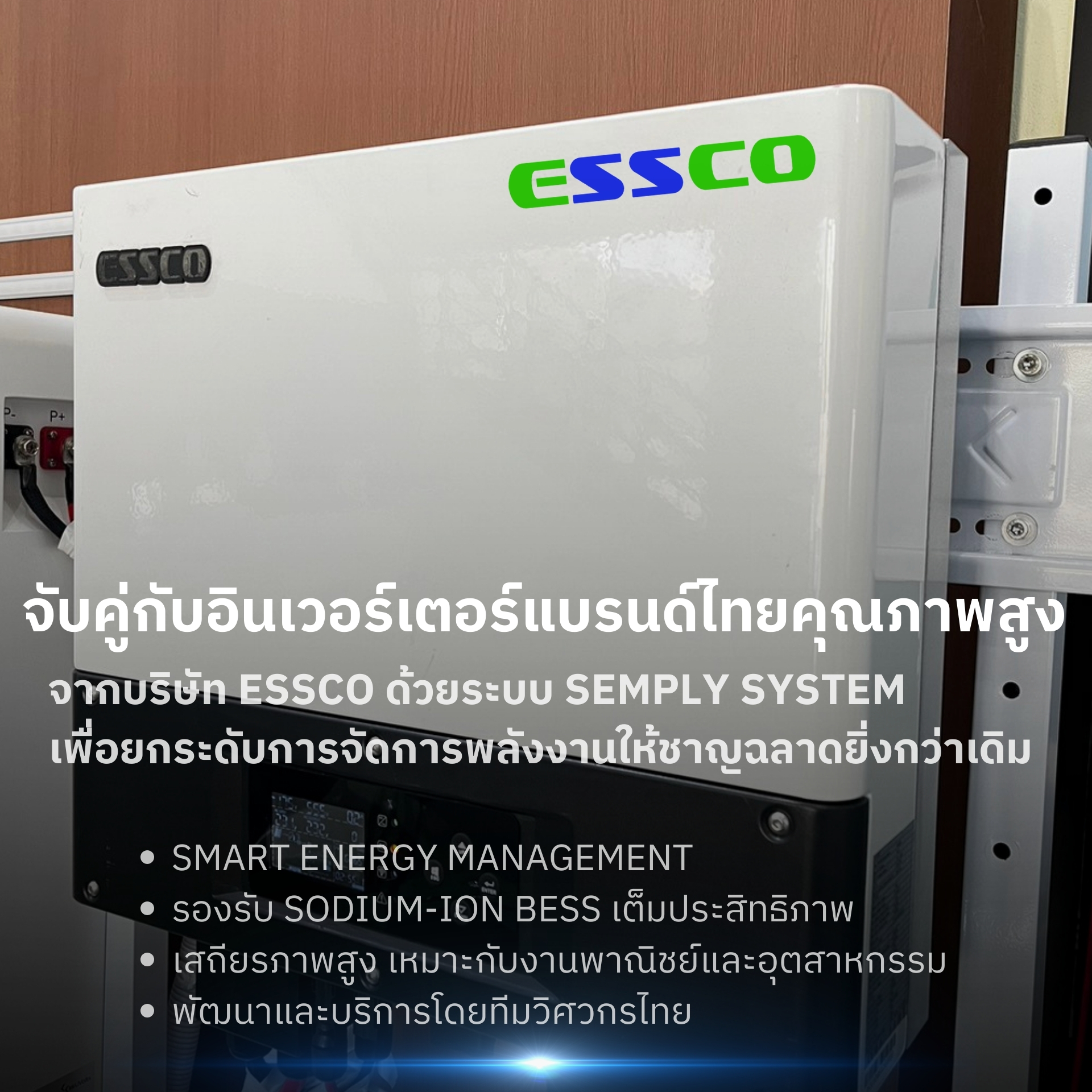 จุดเด่นคือการนำเทคโนโลยีแบตเตอรี่ Sodium-Ion Battery ที่มีมาตรฐานความปลอดภัยสูงมาใช้ โดยระบบสามารถทำงานร่วมกับอินเวอร์เตอร์แบรนด์ไทย ESSCO ผ่าน SEMPLY SYSTEM และมีการจัดการพลังงานอัจฉริยะด้วยระบบ SMART ENERGY MANAGEMENT นอกจากนี้ ยังใช้ระบบ BMS (Battery Management System) ที่ได้รับการพัฒนาขึ้นเป็นพิเศษโดย ECUTEC ซึ่งช่วยให้การรองรับ Sodium BESS เป็นไปอย่างแม่นยำและมีความปลอดภัยในระดับสูง ผลิตภัณฑ์นี้ได้รับการพัฒนาและผลิตโดยทีมวิศวกรไทย 100% จึงมั่นใจได้ในคุณภาพและความทนทานสำหรับการใช้งานในหลากหลายสถานที่ ระบบนี้ผ่านการทดสอบความปลอดภัยที่เข้มงวดหลายรายการ เช่น การทดสอบ Over charge–discharge, Short circuit, Drop test, การจัดเก็บที่อุณหภูมิ 55°C และการทดสอบอื่น ๆ อีกจำนวนมาก ราคาเปิดตัวพิเศษในช่วงโปรโมชันคือ 49,000 บาท/แพ็ก